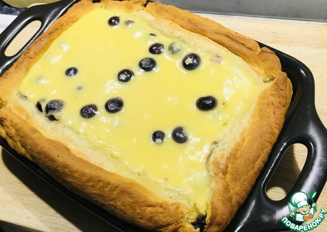 Через 20 минут вынуть пирог, залить сметанной заливкой и снова отправить в духовку минут на 25-30.