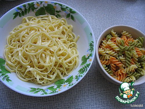 Отварить в подсоленной воде макаронные изделия до готовности. Смазать их растительном маслом, чтобы не слиплись.