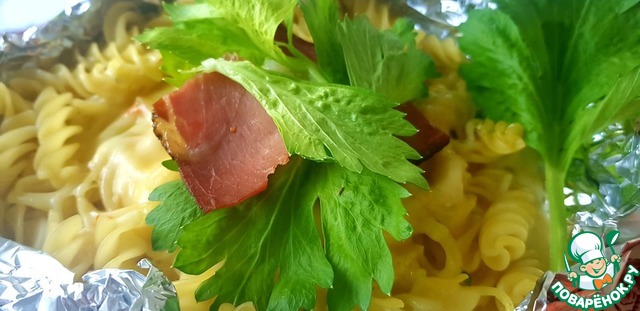 на пачку макарон (400 грамм) ушло 4 яйца, 400 грамм сметаны.