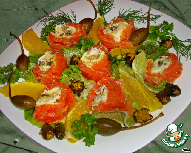 Спасибо за необычную идею!!! Боялась, что будет очень специфично! Но блюдо ушло на "ура"!! Семга попалась не очень качественная((( зато начинка и заправка с лихвой компенсировали всё! Жаль, не могу фото выставить. Красиво! Празднично! Необычно! И очень вкусно!!! Спасибо)))
