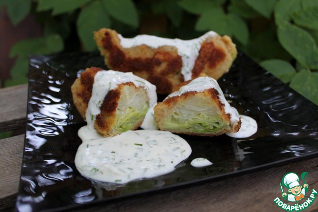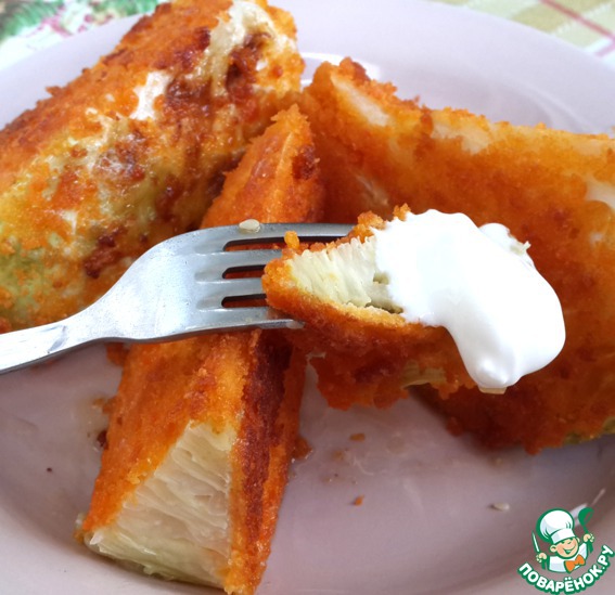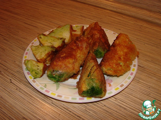 Яйца взбить с солью и перцем. Кусочки капусты обмакнуть в яйце, затем в сухарях, снова в яйце и снова в сухарях.