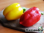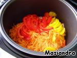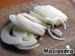 Болгарский перец разрезать пополам, вычистить семечки, удалить серединку и нарезать полукольцами.