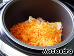 Морковь натереть на крупной терке и выложить в кастрюлю к курице с луком.