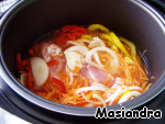 Влить 5-6 мультистаканов воды (так, чтобы вода полностью покрывала курицу), посолить и хорошенько перемешать. Ставим на режим "Тушение" минут на 20-25.