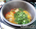 За 5 минут до окончания готовки курицы нарезать зелень петрушки и укропа (можно любую зелень по вкусу), смешать со щавелем и добавить в кастрюлю мультиварки. Тушить еще минут 5.
