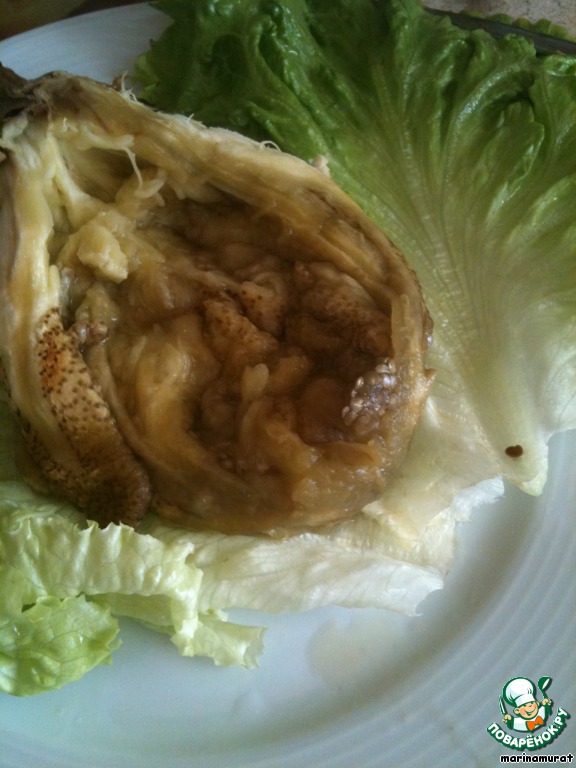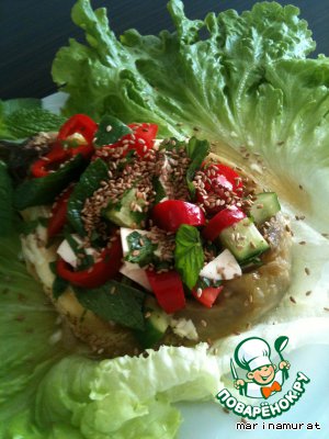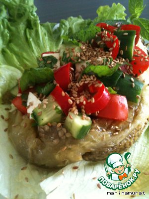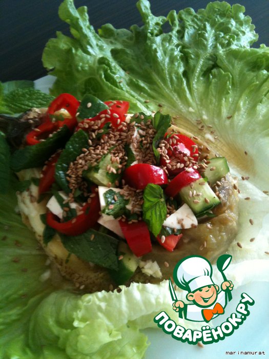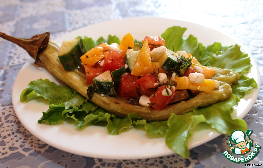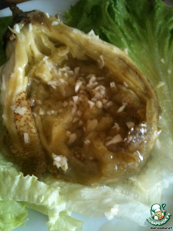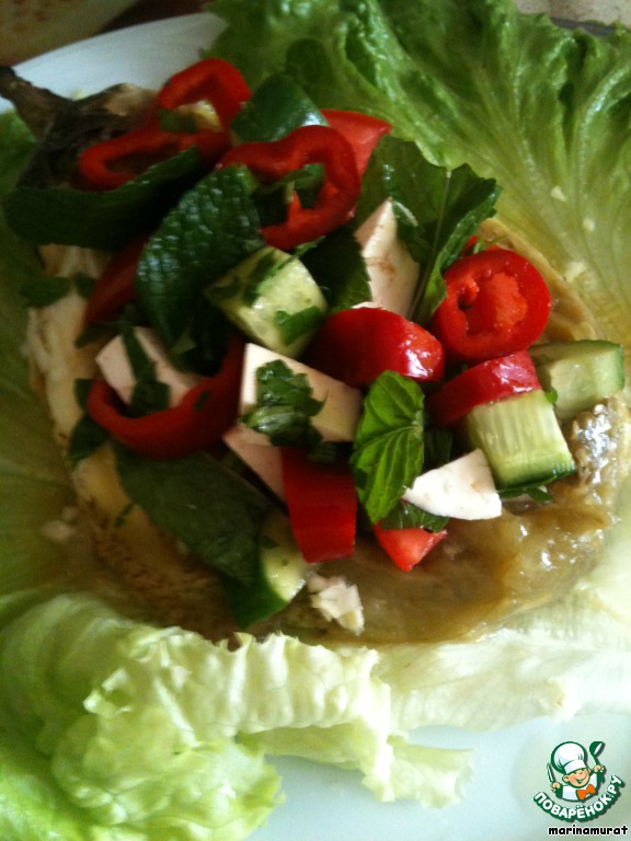 Баклажан чистим от кожи. На тарелку кладем листья салата, на них - баклажан и середину размягчаем ложкой или вилкой.