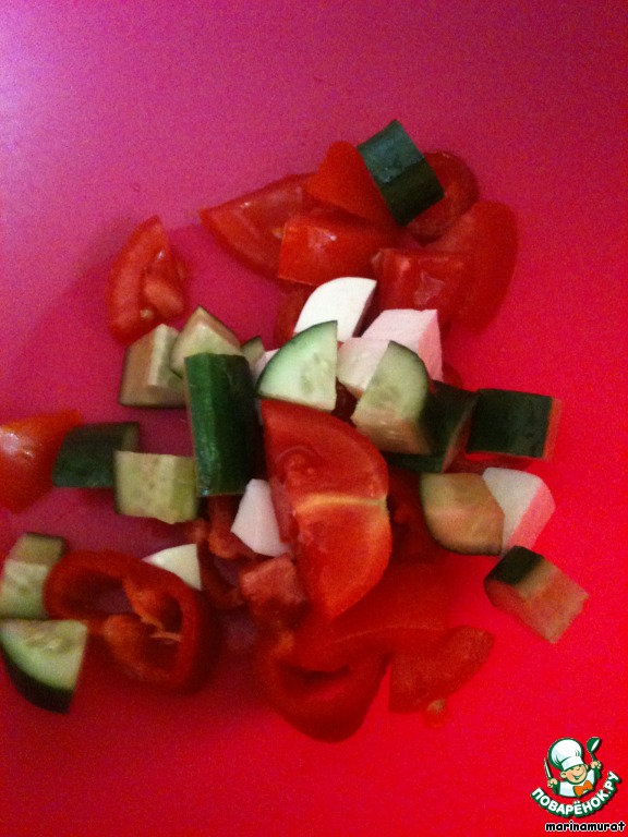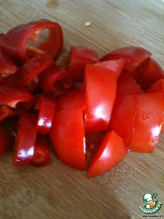 Тем временем делаем "авукма": это смесь ингредиентов нашего салата будущего. Режем помидор кубиками, перец (у меня красный, можно зеленый) режем на кружки, отправляем в салатницу.