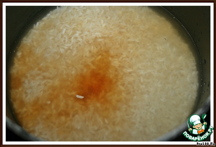 В это время готовим начинку: рис, воду и соевый соус соединить и довести до кипения, потом убавить огонь и накрыть крышкой, варить, пока жидкость не испарится (15 минут). |