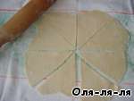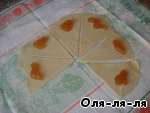 Итак, раскатываем тесто, делим на 8 секторов, на широкий край выкладываем начинку и сворачиваем трубочкой, начиная с широкого края.