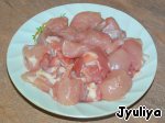 Куриное филе порезать кубиками. Посолить, поперчить. Добавить приправы.