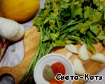 Смешать зелень, цедру лимона, приправы, масло и чеснок.