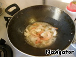 Убрать чеснок и выложить в сковороду отваренные, очищенные креветки. -