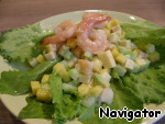 Креветки смешать с нарезанными овощами и фруктами, залить заправкой и перемешать.