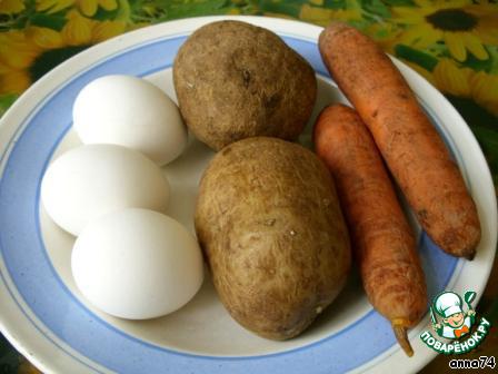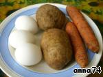 Сварить картофель, морковь, яйца вкрутую.
