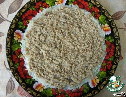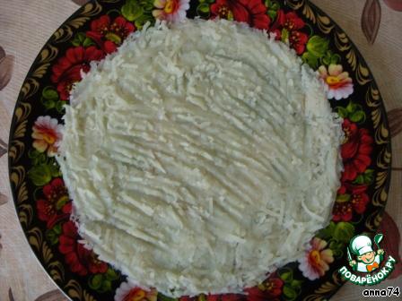 На блюдо выложить слоями (каждый слой уплотнить, присолить, полить майонезом. Майонез я использовала домашний. Рецепт майонеза здесь http://www.povarenok .ru/recipes/show/341 05/ ):