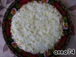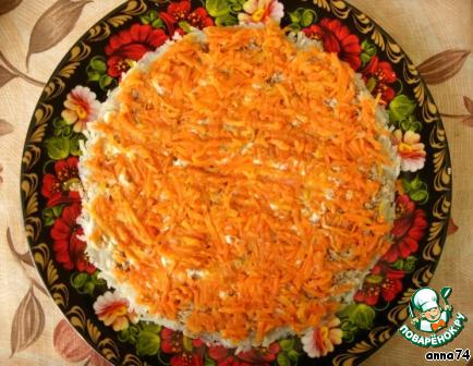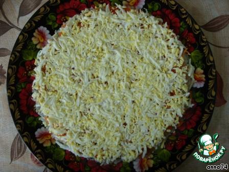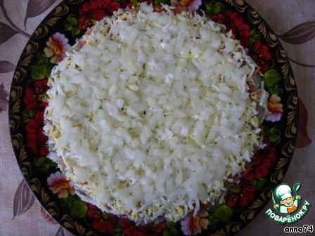Повторить все слои в той же последовательности. Сверху полить майонезом. Поставить салат в холодильник на 2 часа, чтобы пропитался.