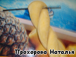 Сложить веретено пополам, накинув его на палочку и скрутить жгутом. Тоже самое сделать и со второй частью теста.