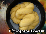 Уложить скрученные жгуты в разъемную форму (рекомендовано было диаметром 26 см, я же использовала 22 см, она просто получилась выше) толстой головкой в центр зацепом и подоткнуть тонкие концы по окружности.