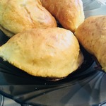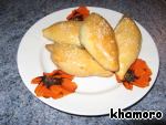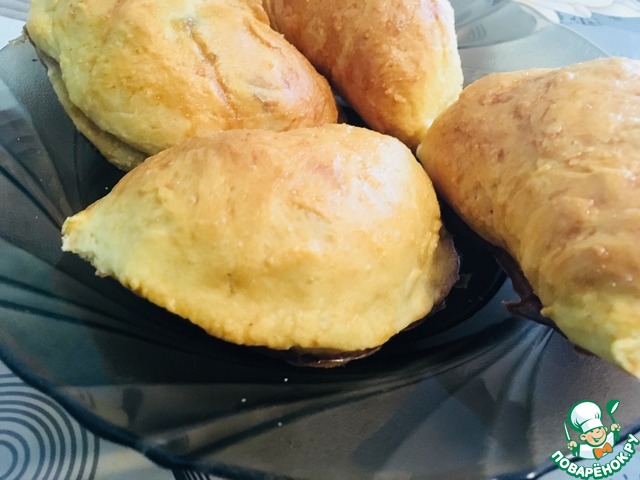 Тесто скатать в жгут диаметром примерно 5 см и нарезать кусочками толщиной 4 см. Раскатать каждый кусочек в овальную лепешку. На каждую лепешку положить начинку (примерно 1 - 1,5 ст. л.). Сформировать пирожки удлиненной формы. Свернуть эти пирожки полумесяцем.