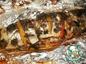 Так как у меня была достаточно крупная рыба, я запекала рыбку 40 минут, потом фольгу развернула и дозапекала ещe 15 минут. -