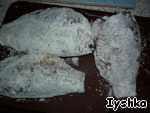 Затем обваливаем в муке, пока разогревается масло в сковороде. -
