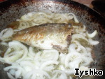 Обжариваем лучок в масле, где жарили рыбку. Мне хотелось быстрее, и я закинула лук вместе с последней рыбкой.