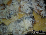 Заливаем нашу рыбку сливочным соусом, так, чтобы лук был на рыбке, ставим в духовку (180 градусов) минут на 15.