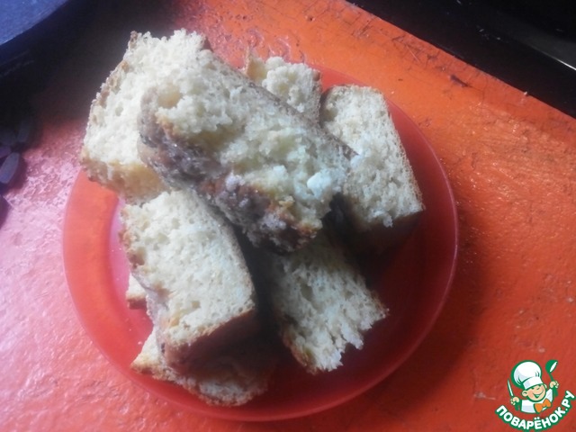 Выпекала в духовке на среднем огне до золотистого цвета. Пирог охладила на противне, а затем порезала на кусочки. |