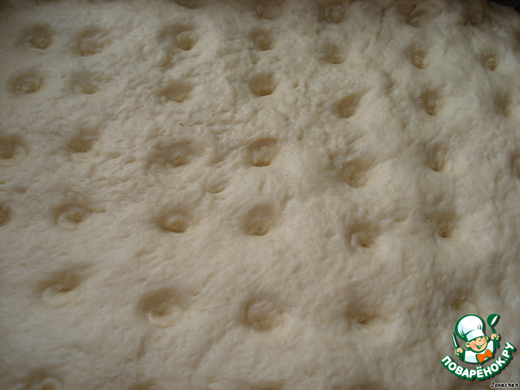 Пальцами сделайте в тесте небольшие углубления. Накройте полотенцем и дайте постоять еще 20 минут. |