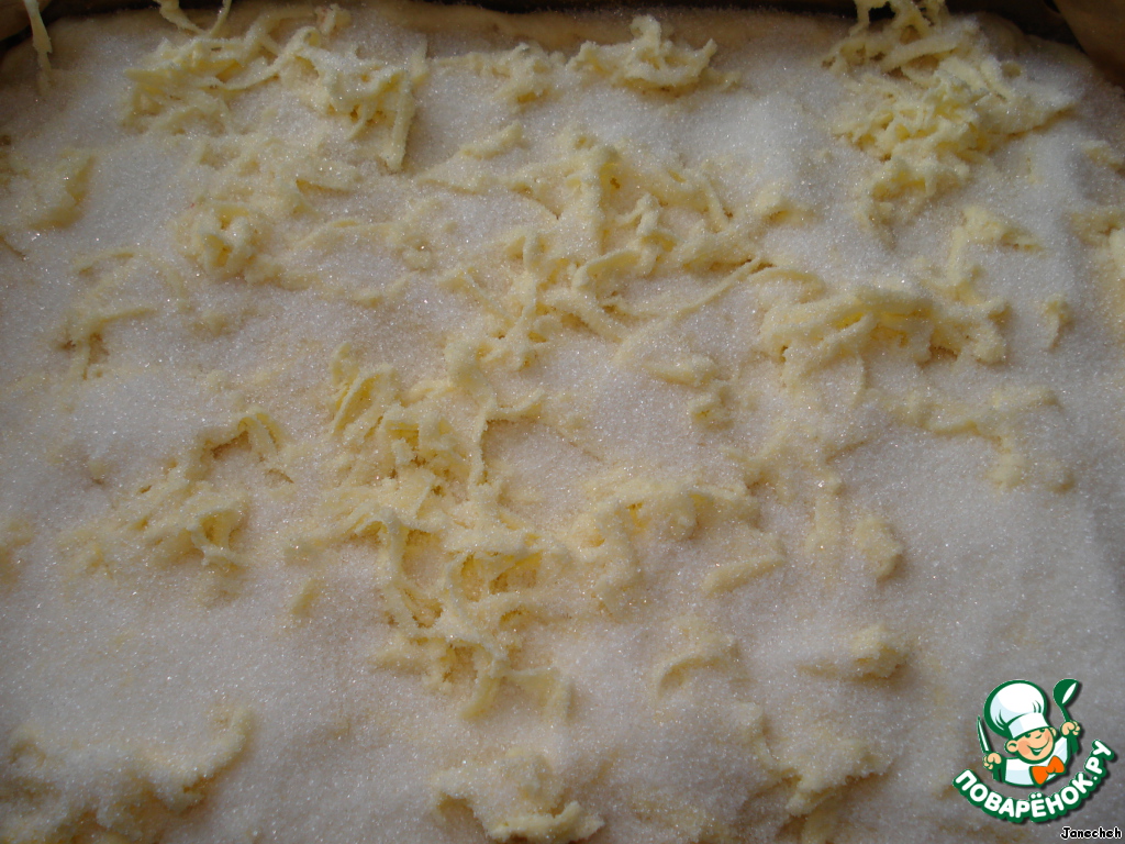 Духовку прогрела до 200 градусов. Масло, замороженное, я натерла сверху на крупной терке и распределила по пласту теста. |
