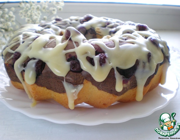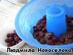 Сверху раскидываем вишни и ставим в духовку, разогретую до 180 градусов, приблизительно на 30 мин. Проверяем на сухую спичку.