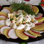 Заправка: смешать йогурт, мёд, горчицу, соль и перец.