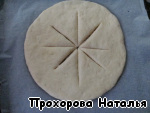Большую часть раскатываем в круг, толщиной около 1,5-2 см. Разрезаем середину крестообразным способом на 8 частей.
