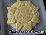 Сердцевинку и лучики смазываем яйцом, а бока - молоком. Сердцевинку посыпаем кунжутом. Выпекать в разогретой до 180 градусов духовке 20 минут.