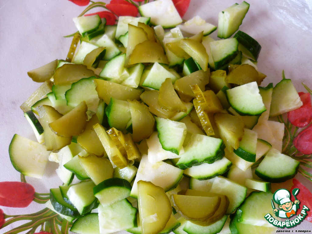 - Огурец (свежий, небольшой - 1шт; малосольный, за неимением оного заменила соленым - 1шт.) — 2 шт