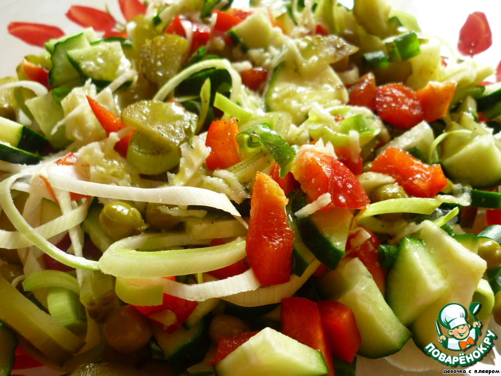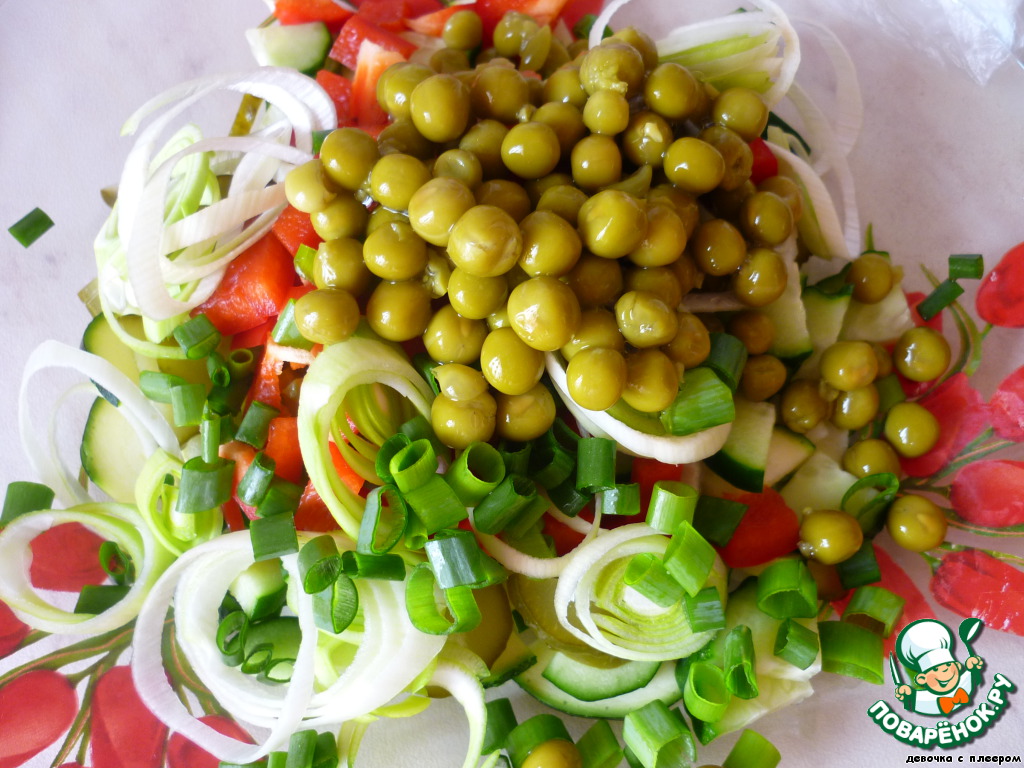Перец нарезать кубиками, лук-порей - тонкими кольцами, зеленый лук порубить, добавить горошек, посолить, поперчить и перемешать.