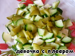 Кабачок, свежий и соленый огурцы нарезать тонкими ломтиками.