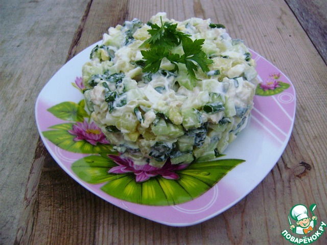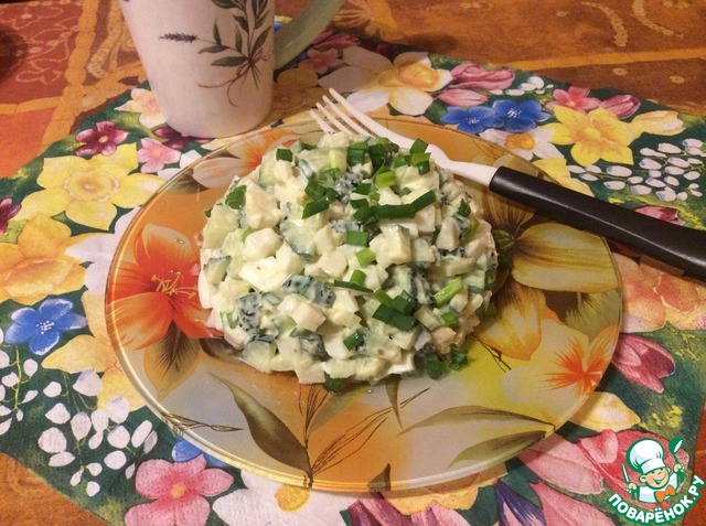 И теперь нарезать зеленый лук, мелко. Посолить и заправить майонезом или другой заправкой по Вашему вкусу. У меня было 1/3 майонеза и 2/3 сметаны. И можно подавать салат!