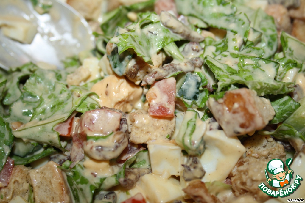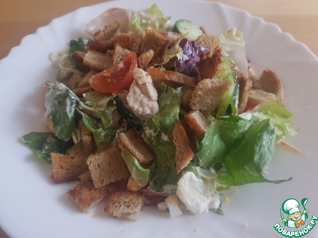 Мясо, яйцо, огурцы, помидоры и салат заправляем майонезом, по вкусу добавляем соль. Сухарики добавляем перед самой подачей салата, и еще раз все перемешиваем.