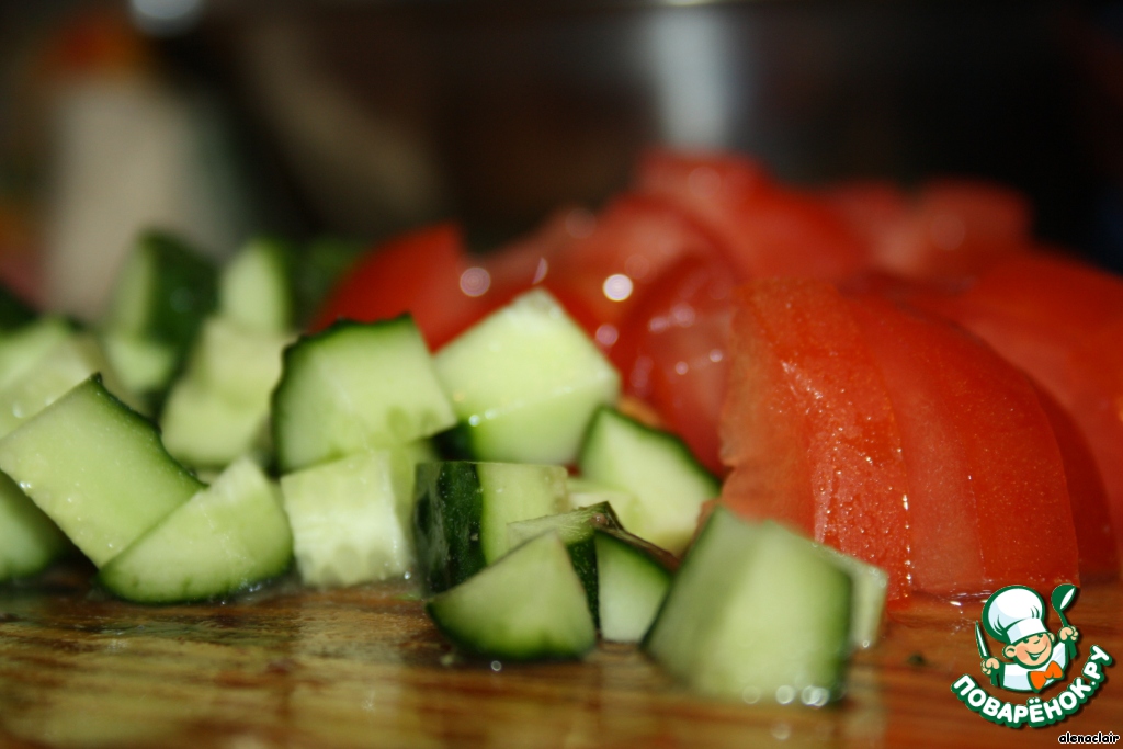 Помидоры и огурчики, нарезаем так же, не очень мелко.