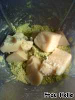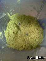 К фисташковой муке добавляем марципан, сахар и белки. Все перемешиваем до однородной массы. Лучше делать это погружным блендером, но так как мой приказал долго жить, я делала все в том же. Но это такая морока, что наверно было бы проще перемешать вручную.
