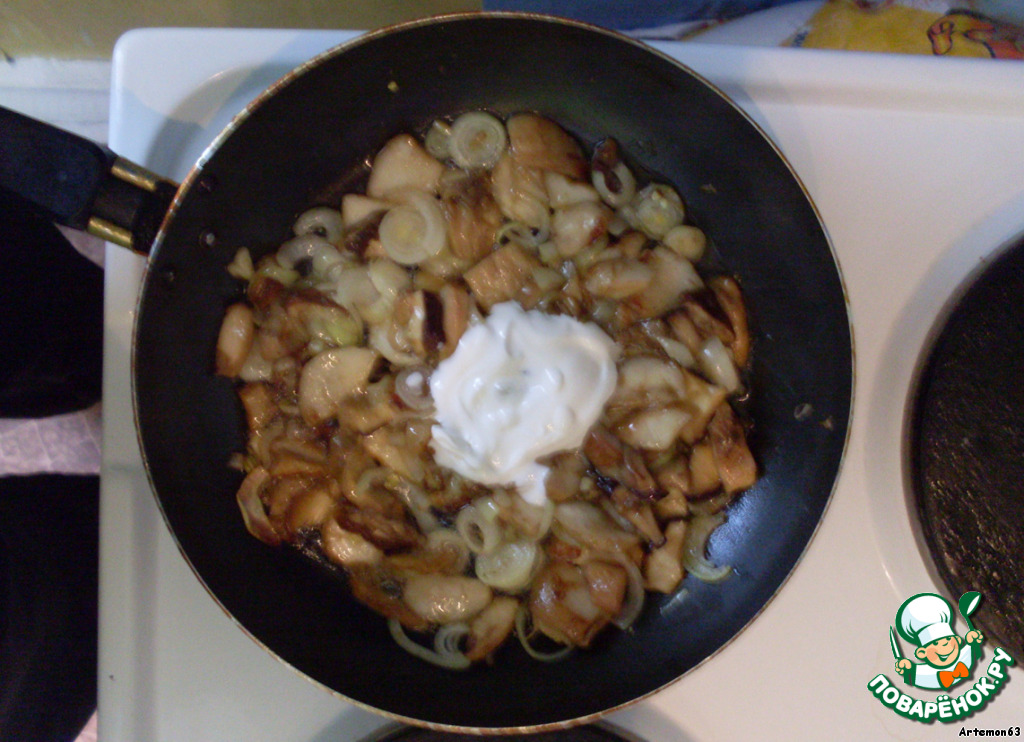 Обжариваем грибы с луком на подсолнечном масле, пока лук не станет золотистым, добавляем сметану, перемешиваем, солим.