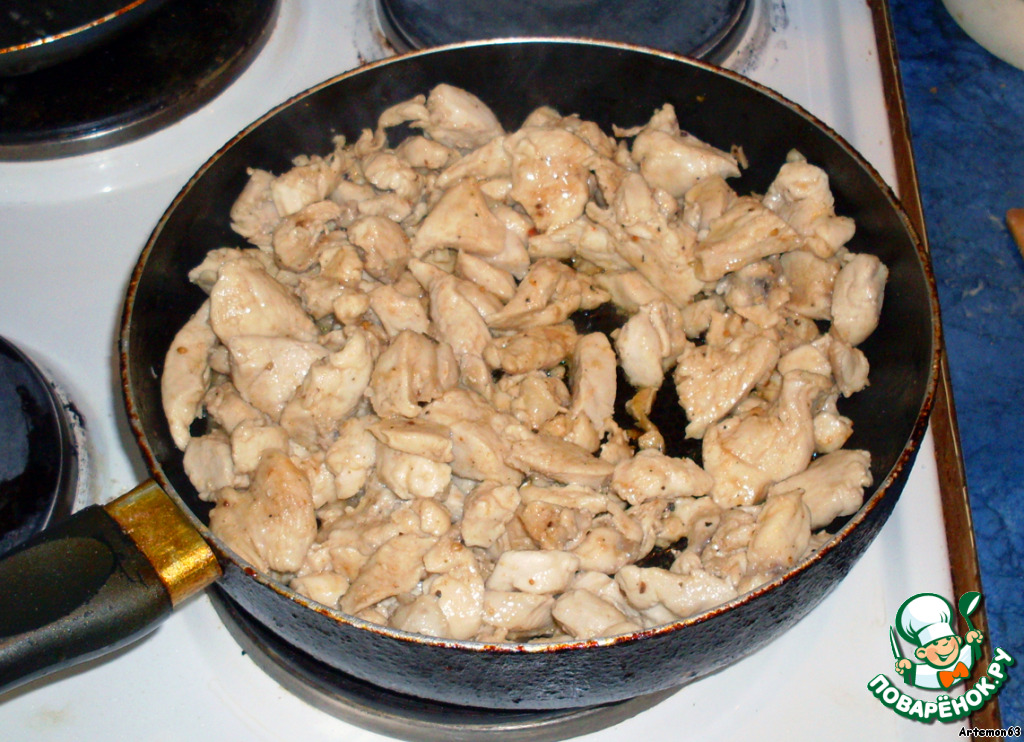 Обжариваем курицу на подсолнечном масле до появления румяной корочки, солим, перчим.