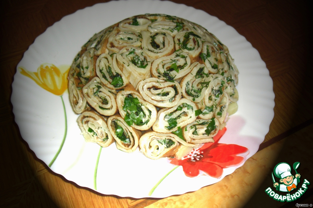 Блинчик, пока он теплый, намазать с одной стороны майонезом, посыпать зеленью и свернуть рулетиком. -