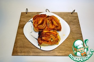 Рулет выкладываем на противень. И ставим в разогретую до 240-250 градусов духовку на 15-20 мин.