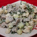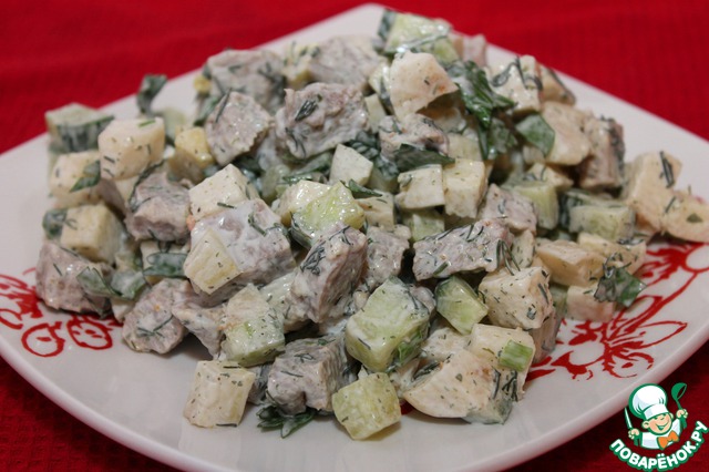 огурчик + редис + отваренное мясо мелко разобрать + посыпать творожком несладким + зелень.