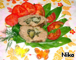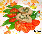 Фарш (рулет) получился очень нежным. Дело было вечером, рулет ели без гарнира. С помидорами и зеленью.