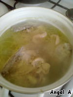 Наливаем в кастрюлю воды, доводим ее до кипения и выкладываем куриное филе. Можно двугие части курицы, я брала бёдрышки. Снимаем шумовкой пену и варим до готовности курицы – около 20 мин. Курицу достаем из бульона, а в кастрюлю доливаем воды.