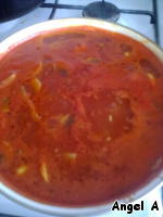 Выкладываем все в кипящий бульон, добавляем томатную пасту, солим, перчим по вкусу, варим до готовности овощей.