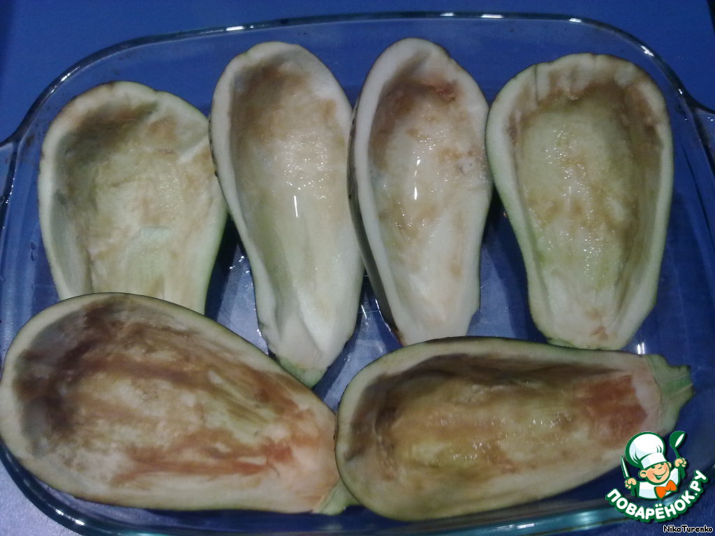 Аккуратно вырезаем мякоть баклажана, оставляя стенку в лодочке примерно 3-5 миллиметров. Ставим наши лодочки в разогретую духовку (180 градусов) на 15 минут.